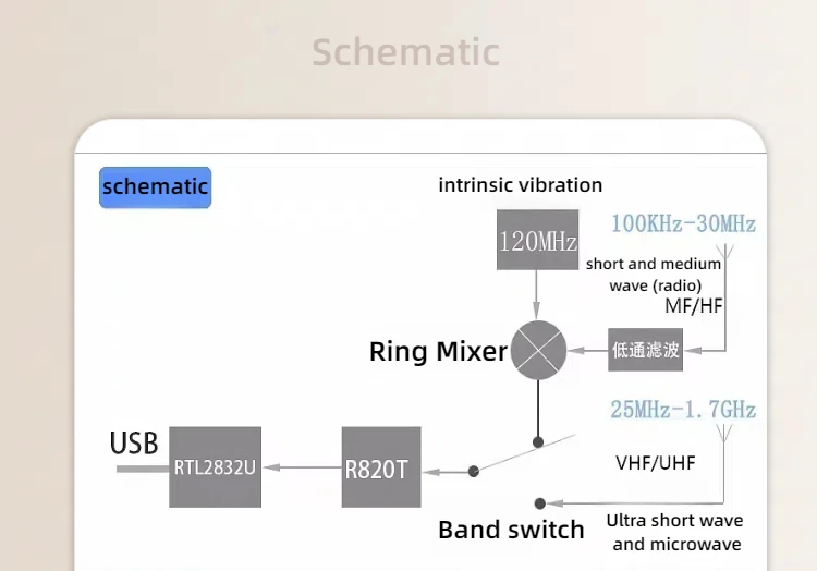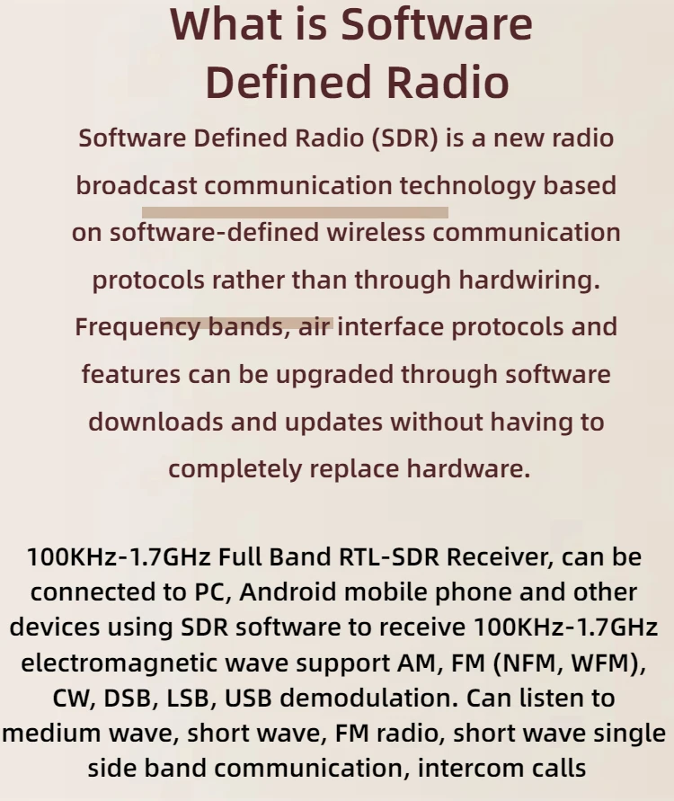 100KHz-1.7GHz full-band RTL-SDR receiver, can be connected to PC, Android mobile phone and other devices, use SDR software to receive electromagnetic waves, support AM, FM (NFM, WFM), CW, DSB, LSB, USB demodulation, can listen to medium wave, short wave, FM radio, short wave single sideband communication, walkie-talkie calls.