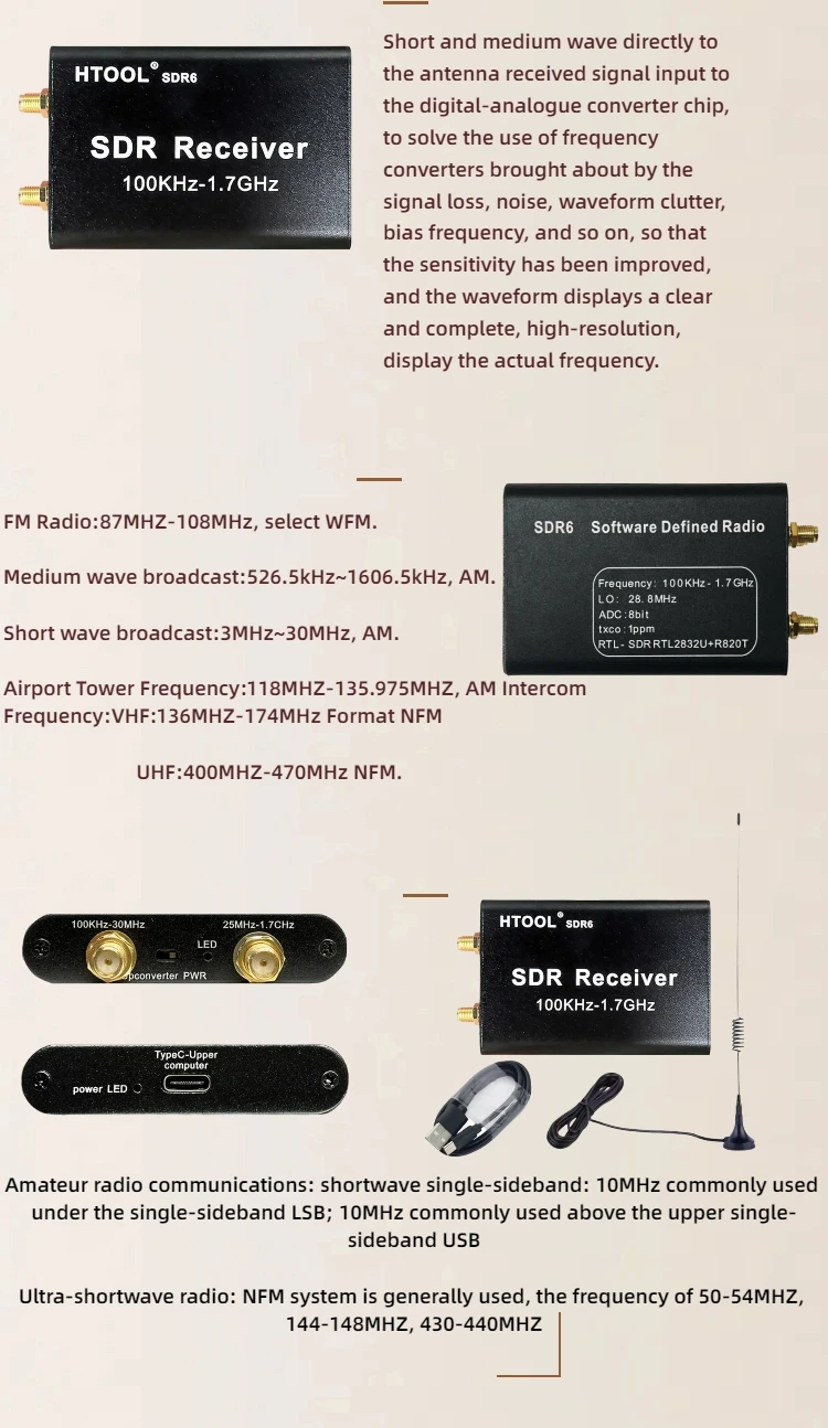 100KHz-1.7GHz SDR6 Receiver (Full Band SDR Receiver) Full Band RTL-SDR Receiver Aviation Short Wave Broadband