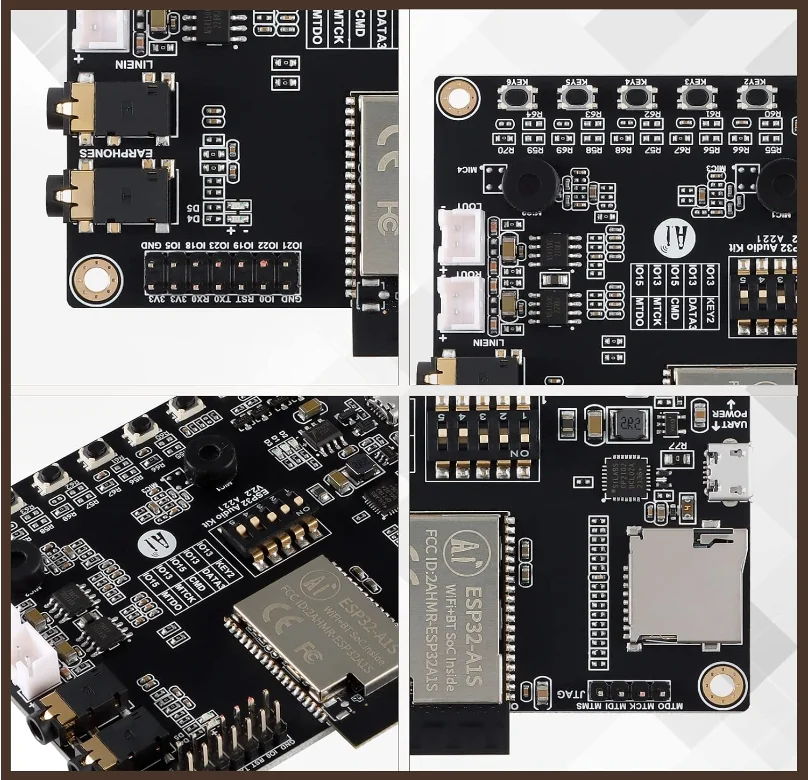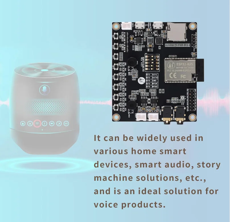 ESP32-Audio-Kit is a small audio development board based on ESP32-A1S module. Most audio peripherals are distributed on both sides of the development board, supporting TF card, headphone output, two microphone inputs and two speaker outputs. It is convenient for developers to develop quickly. Suitable for home smart devices, smart speaker solutions, children's story machine prototypes,